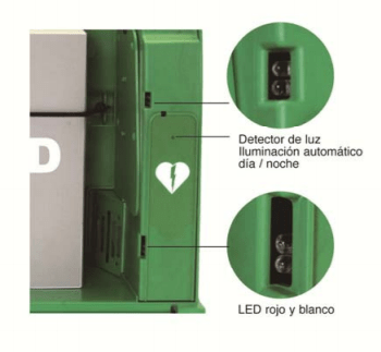 En la cara frontal se muestran la secuencia de supervivencia y tres pictogramas claros con instrucciones de uso. En los lados se encuentran AED (inglés) y DAE (latín) separados del logotipo del desfibrilador.